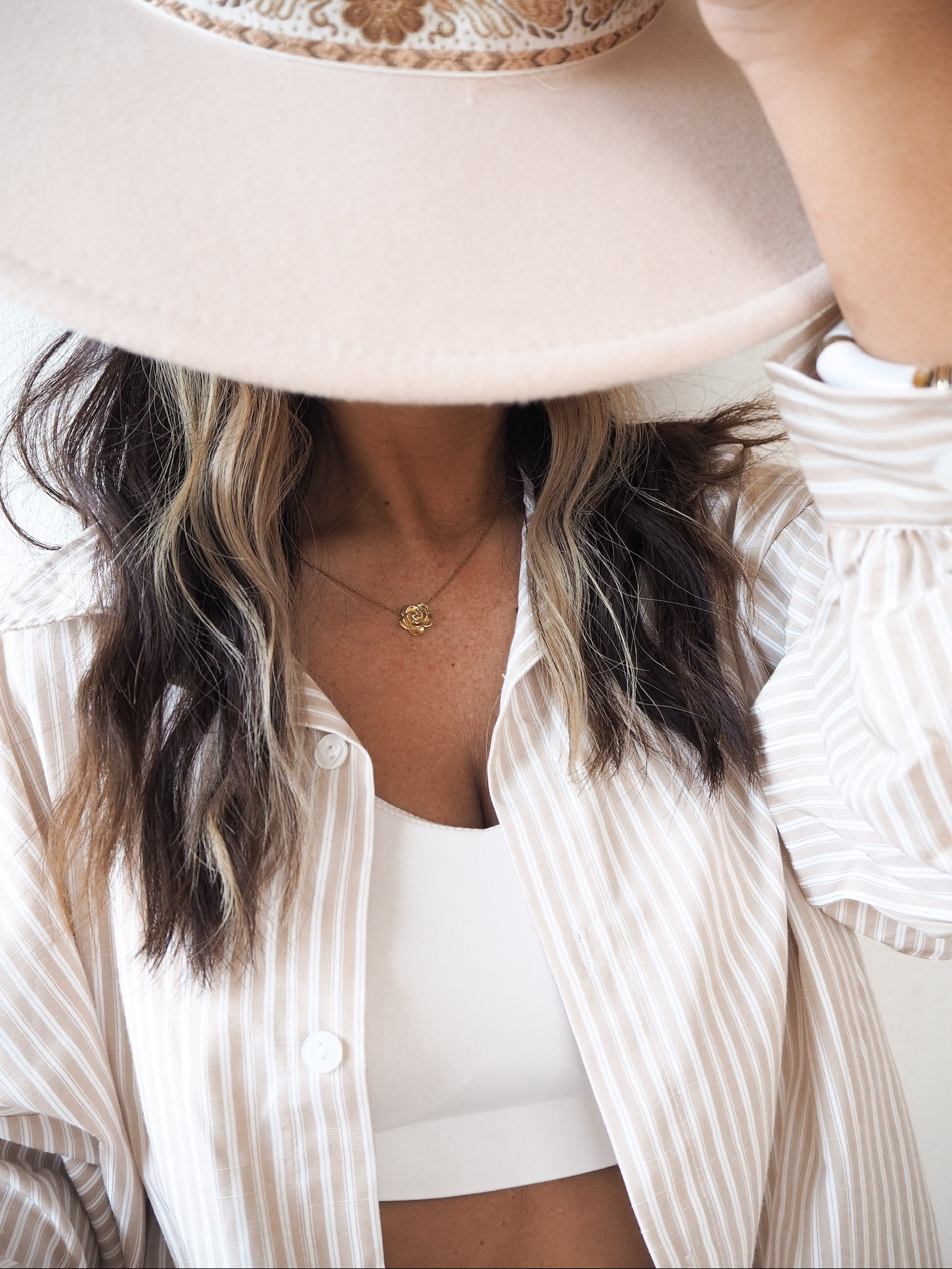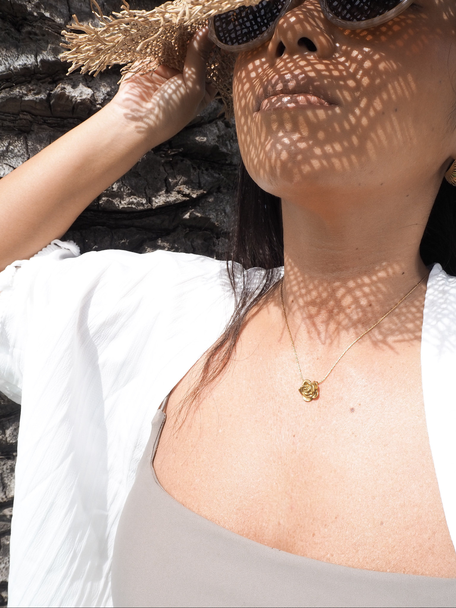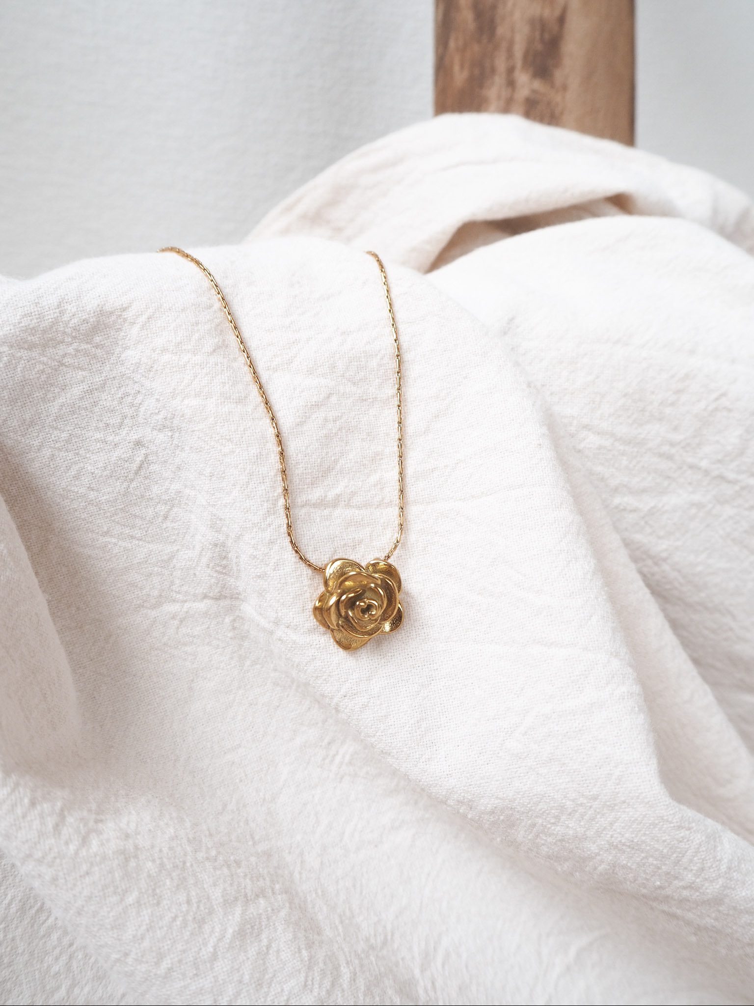 立体感のあるローズモチーフが、大人のカジュアルスタイルにさりげない華やかさを添えるネックレス。