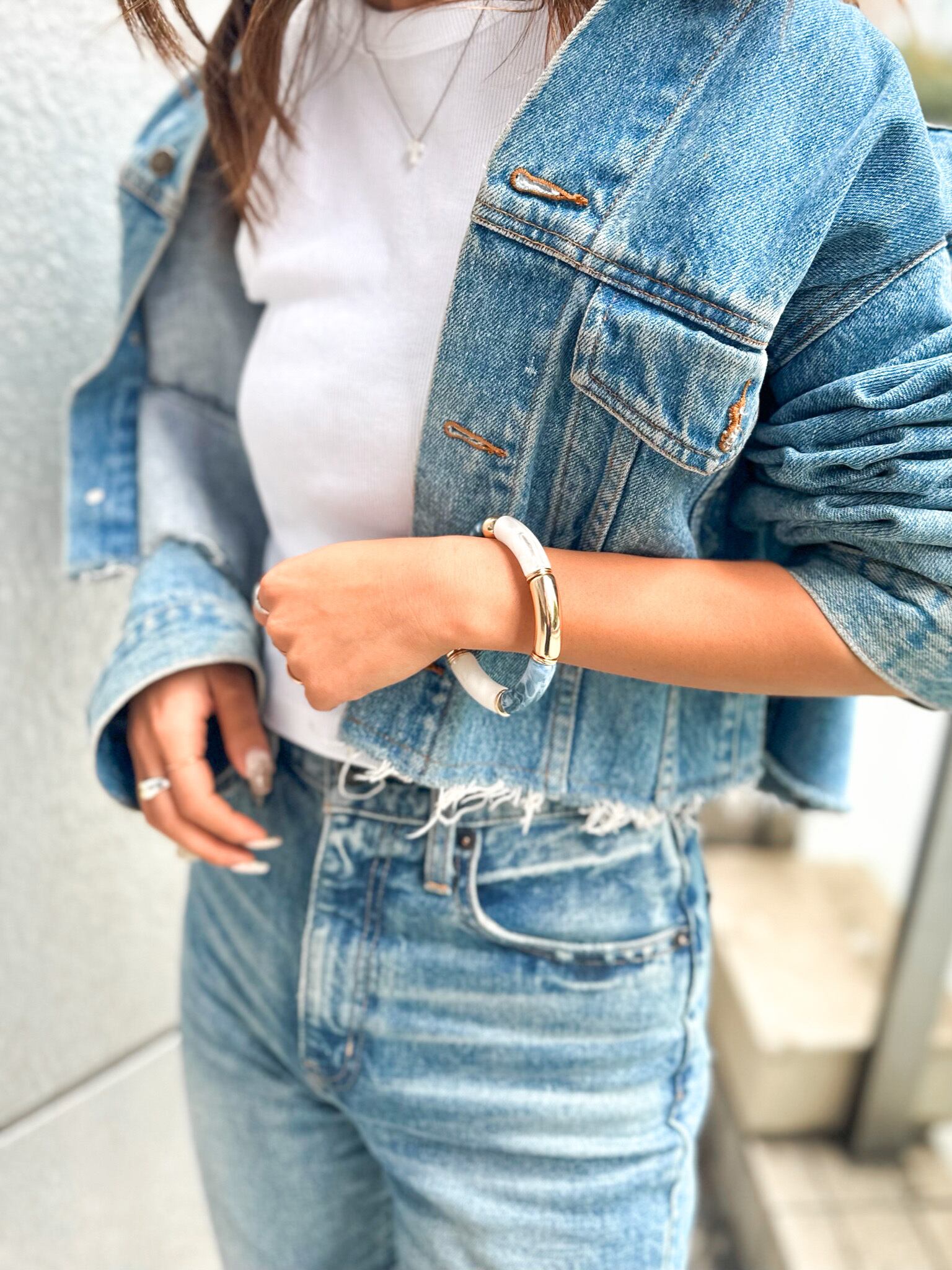 太めのブレスレットは、1つでおしゃれを決められるアイテムです。