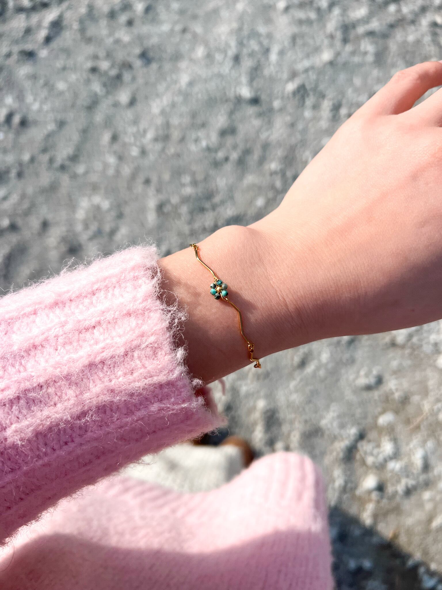 ターコイズビーズがお花になったブレスレット入荷しました。チェーンも、小豆チェーンではなく、デザインチェーンなのが、かわいすぎる。